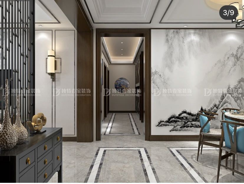 设计说明:本案例来自绿景未来城楼盘项目,房子面积135平三室两厅一厨两卫户型结构,业主是一对非常可爱的中年夫妇,这套房子是他们的第二套房子,前期咨询就比较有想法,最终确定下了新中式风格,大理石的电视背景墙整体感极强,餐厅和客厅中间的隔断也比较新颖,水蓝色的沙发让新中式区别于中式的暗沉,最后装下来整体花了19万。